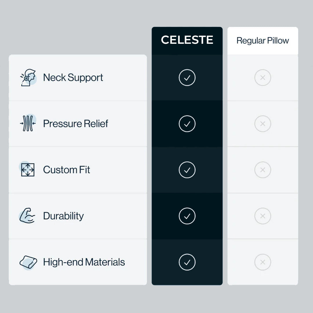 Experience pain-free mornings with the Celeste Pillow. Its advanced support relieves neck pain and improves sleep quality, so you wake up refreshed and ready to take on the day!