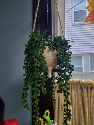 Samantha R. JUL 06, 2025Verified BuyerThis planter instantly brightened up my kitchen window. I planted a little string of pearls in it and it looks like he has a funny hairstyle. Love it!