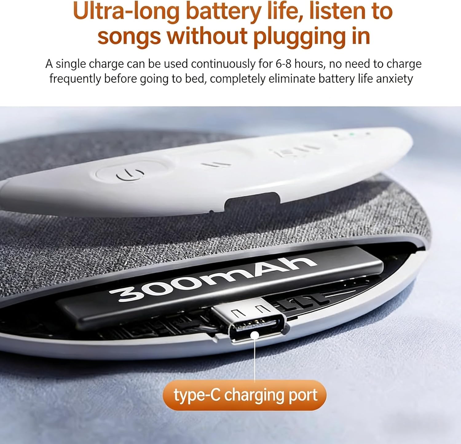 The 300mAh rechargeable battery lasts up to 8 hours on a single charge, enough for a full night of sleep at normal volume.