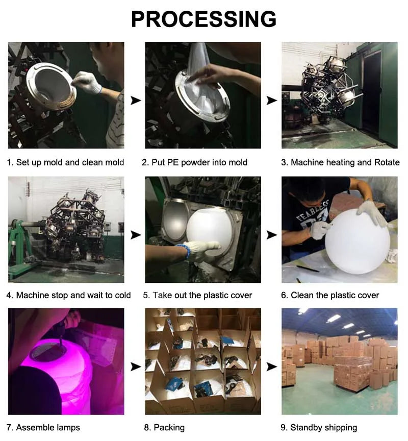 LED ball light is made by rotomolding process. The material is environmentally friendly PE plastic. The built-in LED light green lighting source has the energy saving characteristics, environmental protection and long time working life.